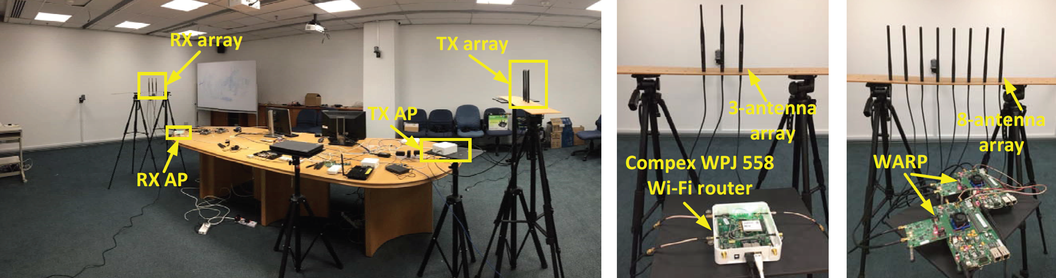 WARP v3 플랫폼과 일반 와이파이 라우터를 사용해서 채널 샘플링 장치를 구성했고, 워크스테이션 서버를 이용해서 컴퓨팅을 했다고 한다. 위 사진은 여러 테스트 환경 중 실내 회의실 환경의 구성이다.