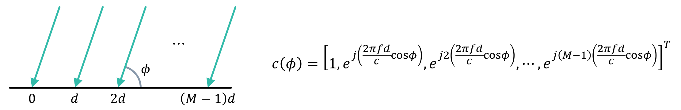 - $c(\phi)$ : $M$-element receive array steering vector. $M$개의 안테나에서 수신한 신호 사이의 Phase 관계.